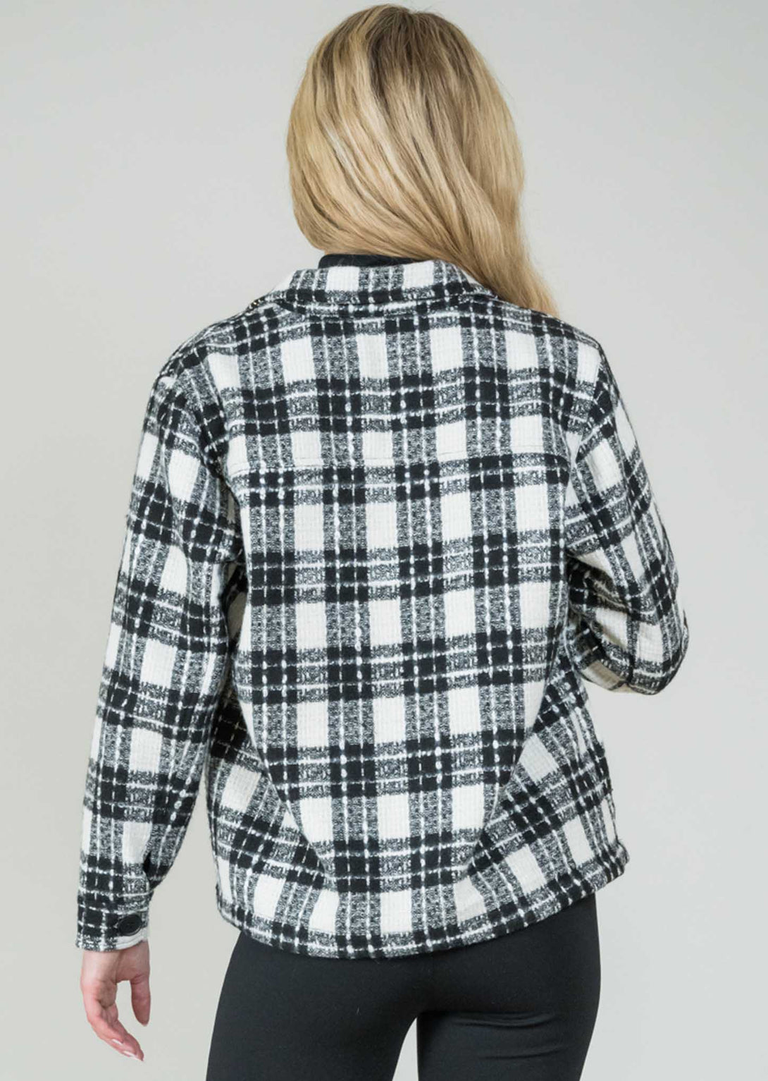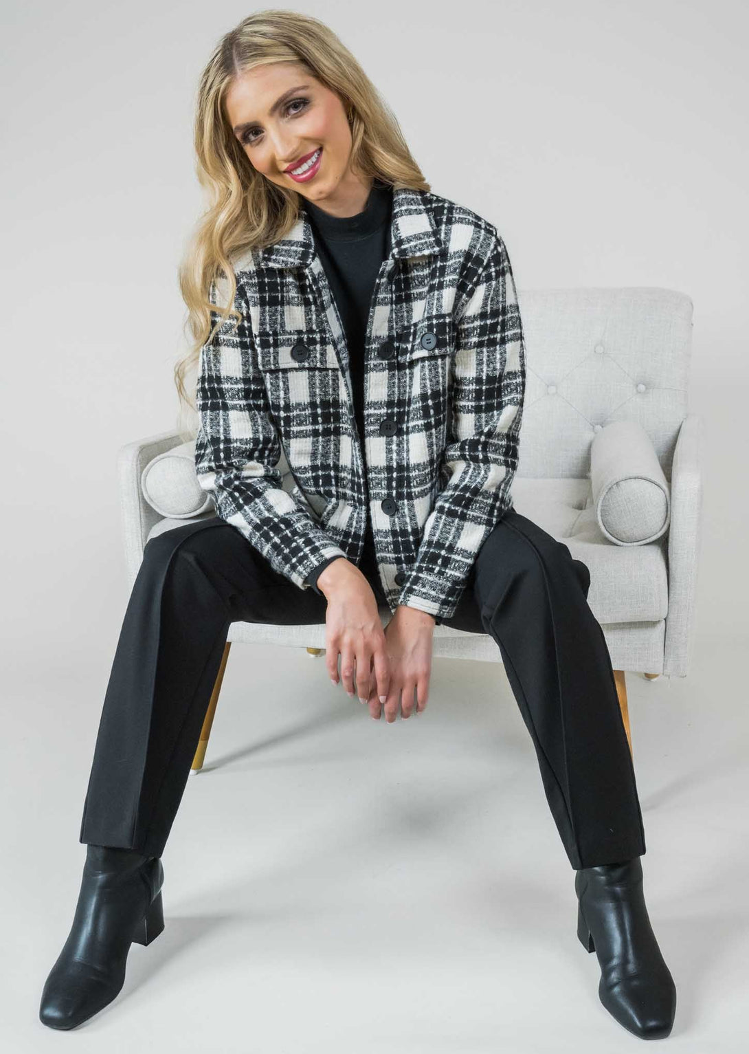 The Emmie fabric blends polyamide, nylon, and polyester fibers, creating a soft and rich-looking textile. It is crafted into a modern yet chic-styled jacket that enhances the inherent richness of the fabric.