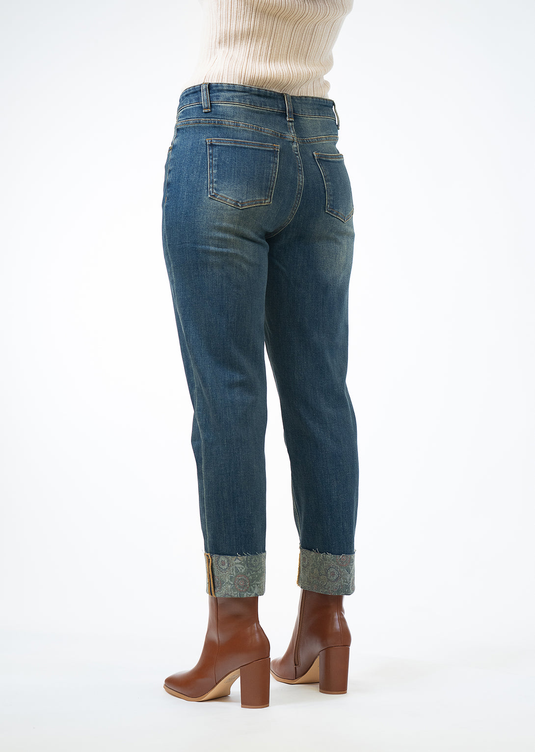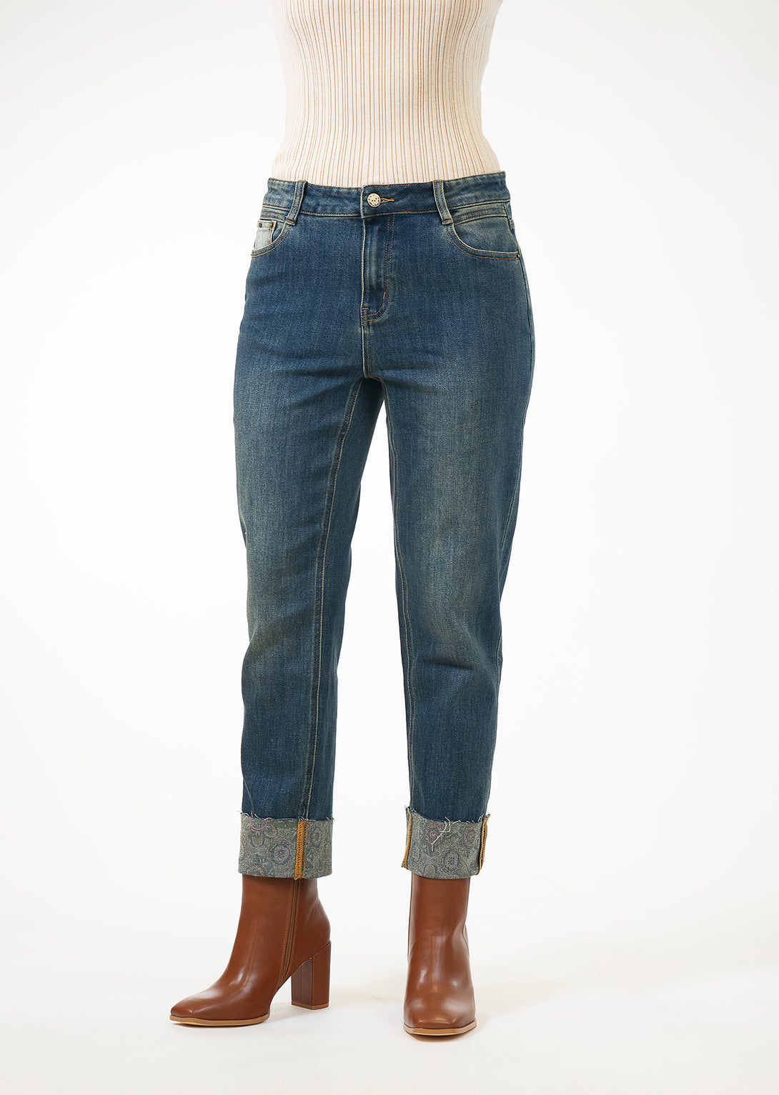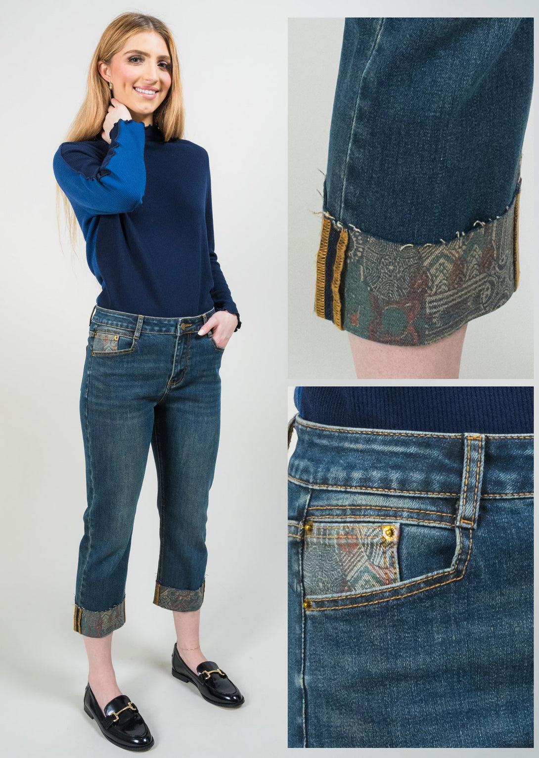 Looking for a casual yet chic wardrobe staple? Our Medallion Printed Denim Cuff Pant is a versatile piece you can wear time and again.
