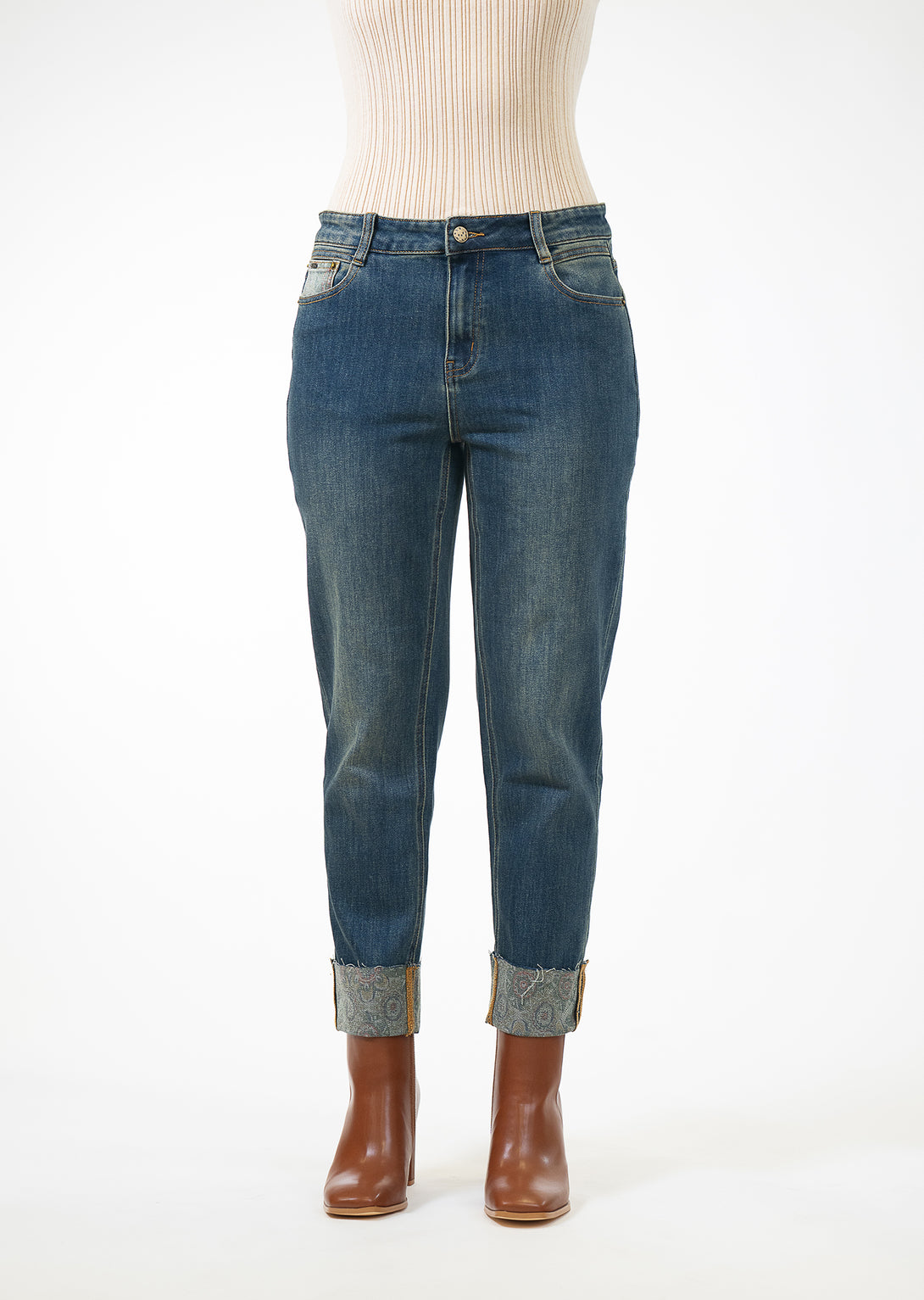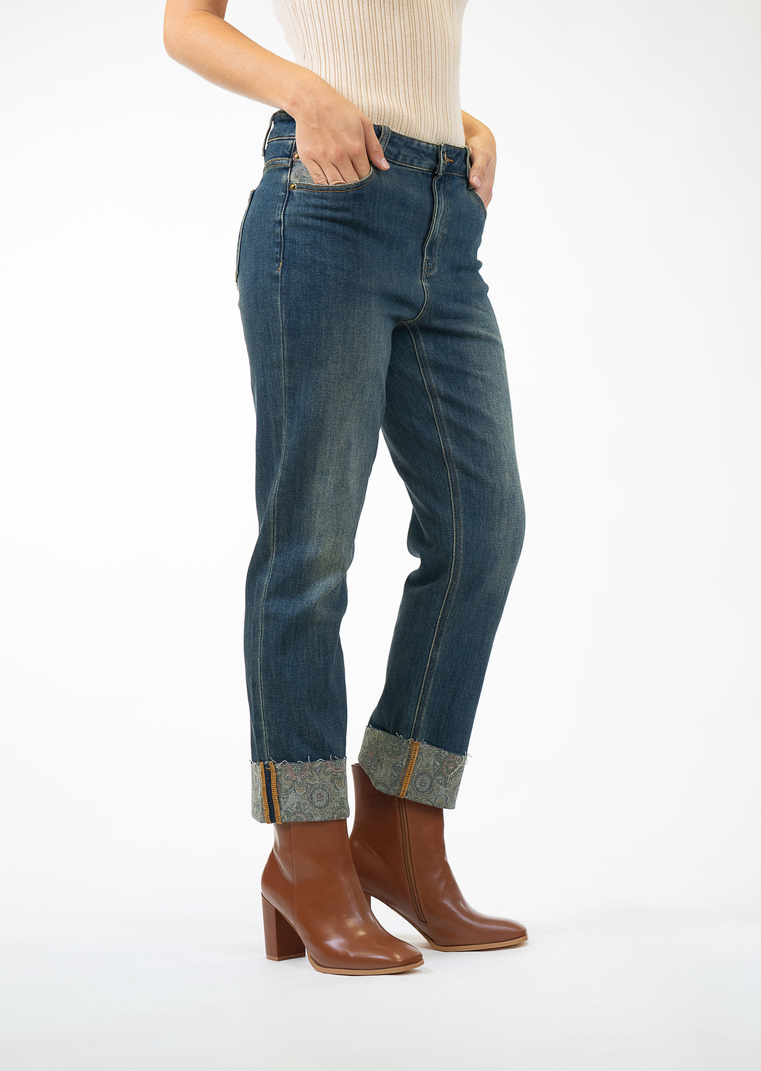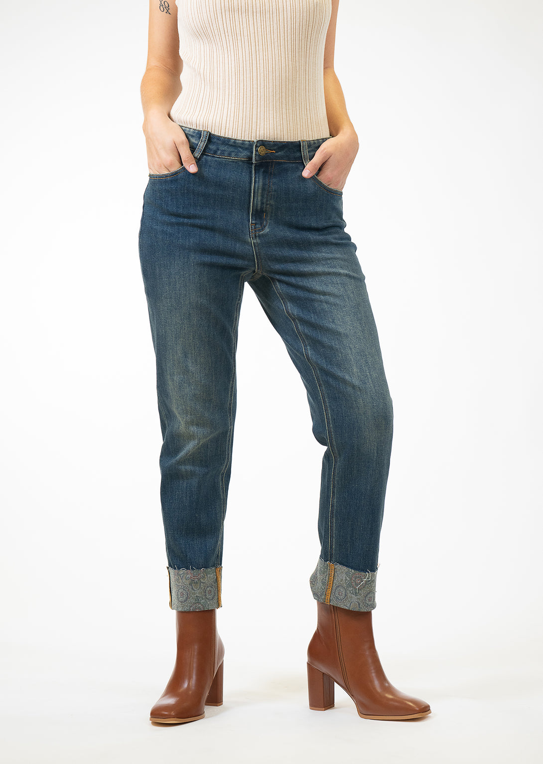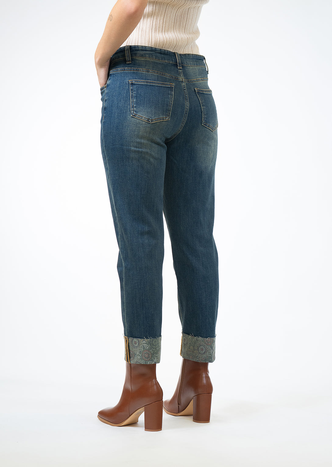 Looking for a casual yet chic wardrobe staple? Our Medallion Printed Denim Cuff Pant is a versatile piece you can wear time and again.