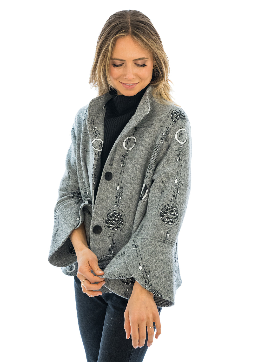 This structured jacket combines contemporary silhouette with refined tailoring. The mandarin collar offers a polished neckline, while the button front closure ensures easy layering. Split bell sleeves create an elegant drape with subtle movement, making this piece versatile for both professional and elevated casual settings. The clean lines and thoughtful construction make it an essential addition to any sophisticated wardrobe.