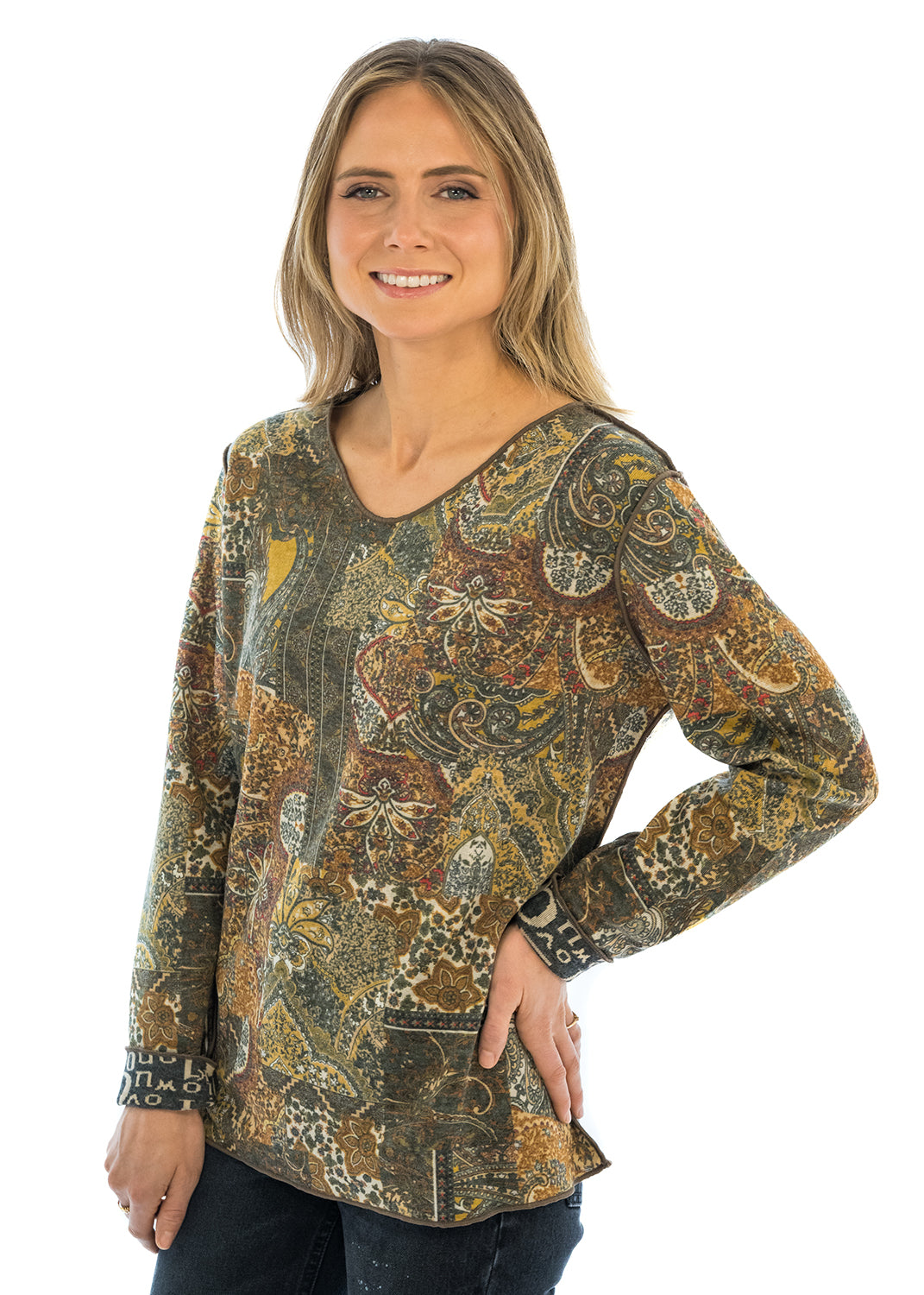 Embrace versatile elegance with this reversible V-neck design featuring a sophisticated paisley pattern. Crafted for the discerning wearer, this piece offers two distinct looks in one garment—flip it to transition seamlessly from day to evening. The flattering V-neckline elongates the silhouette while the timeless paisley motif adds refined visual interest. Perfect for layering or wearing solo, this reversible essential maximizes your wardrobe's potential with minimal effort. A smart investment for those who value both style and practicality.