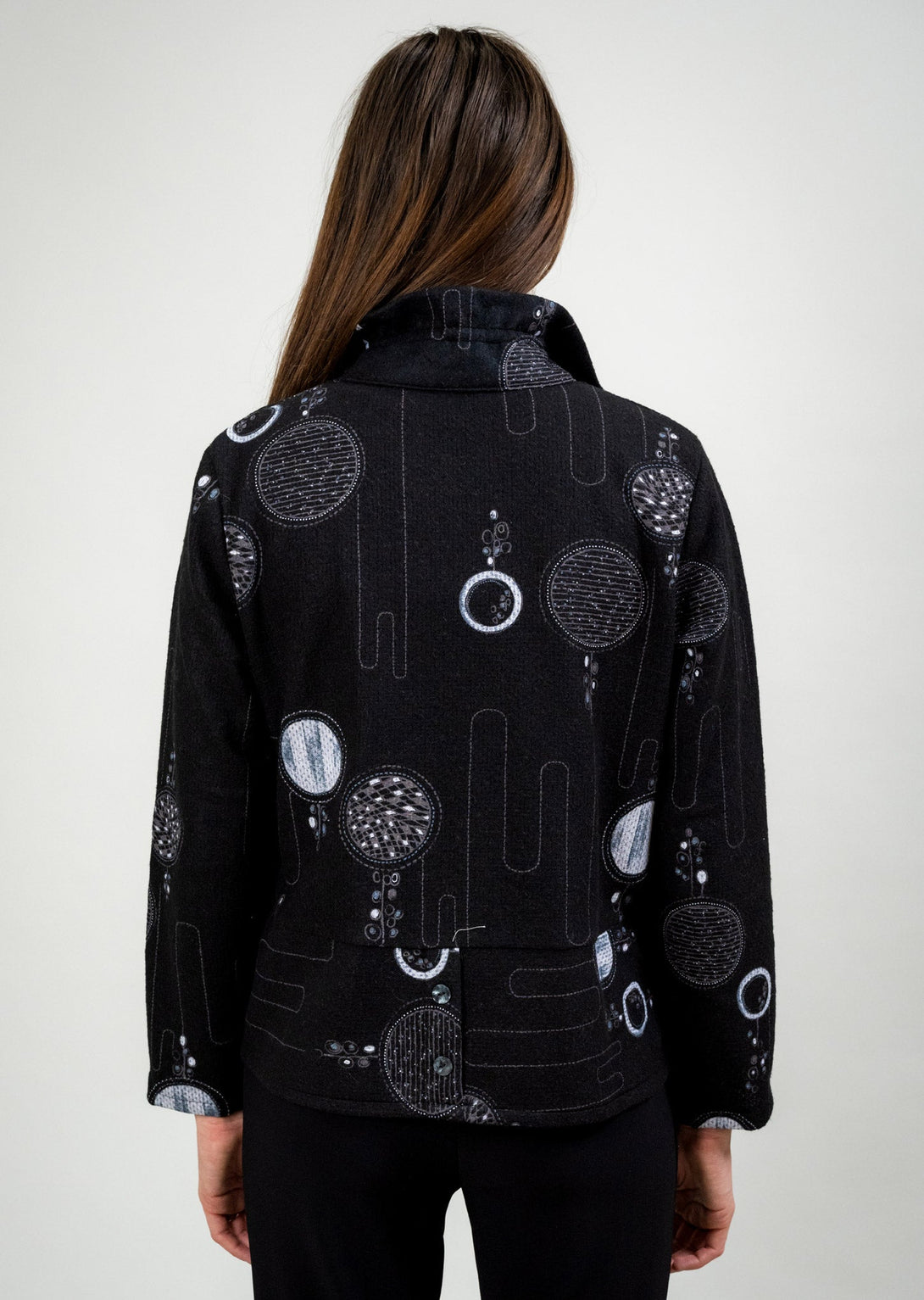 This jacket is a chic blend of structure and ease, designed with a wire collar that lets you adjust the neckline to your liking. Its artistic circular motif in black and grey gives it a modern, graphic touch, while the button-back detail adds a subtle twist. With two front patch pockets for practicality and a slightly tailored cut, it’s a versatile piece that transitions seamlessly from casual layering to polished outings.