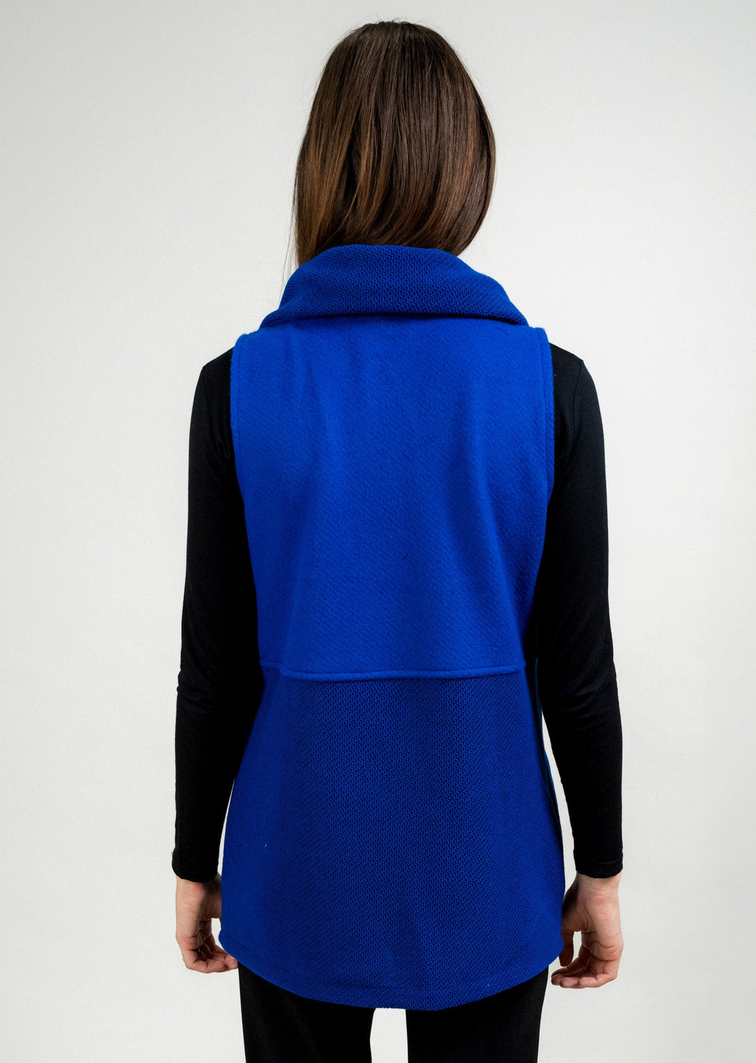 This zip-up vest with drawstring collar is a sleek layering piece designed for both comfort and style. Crafted in a vibrant blue tone, it features a soft structured body with a modern, elongated silhouette. The full front zipper offers versatile styling, while the drawstring collar adds a casual yet refined detail that can be adjusted for warmth. Perfect over lightweight knits or long sleeves, this vest brings an effortlessly polished finish to everyday looks.