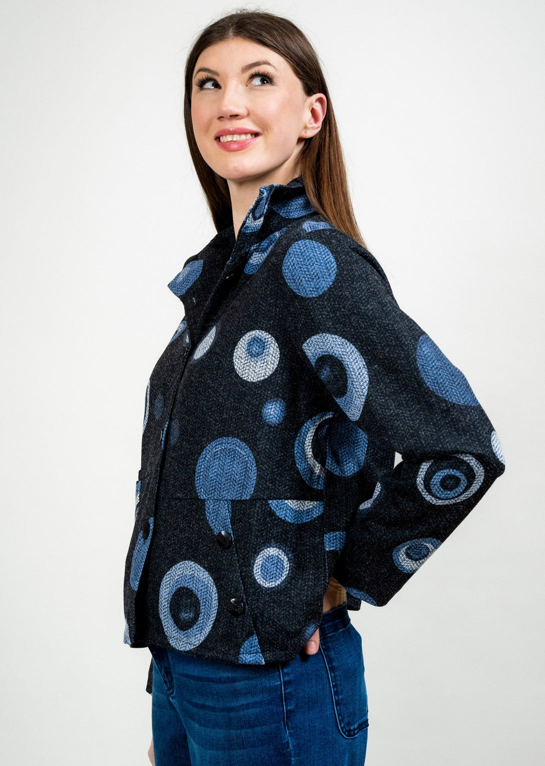 This playful yet sophisticated jacket brings a modern edge to your wardrobe with its bold circular motif in denim blue tones against a deep black background. Designed with a sculpted wire collar that can be styled up or down, it features button detailing along the front and at the back for added interest. The relaxed silhouette and functional pockets make it as practical as it is stylish, perfect for layering over both casual and polished looks.