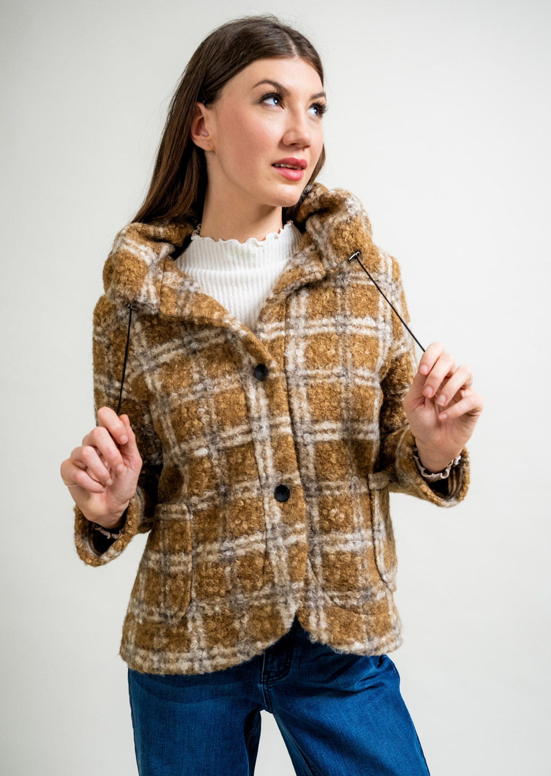 A modern twist on timeless outerwear, this coat is crafted in a rich bouclé texture with a soft plaid pattern that exudes cozy sophistication. The pouff neck with adjustable drawstrings adds both warmth and style, while the relaxed silhouette ensures comfort without compromising elegance. Finished with button closures and practical pockets, it’s the perfect layer for crisp days when you want to feel polished yet effortlessly chic.