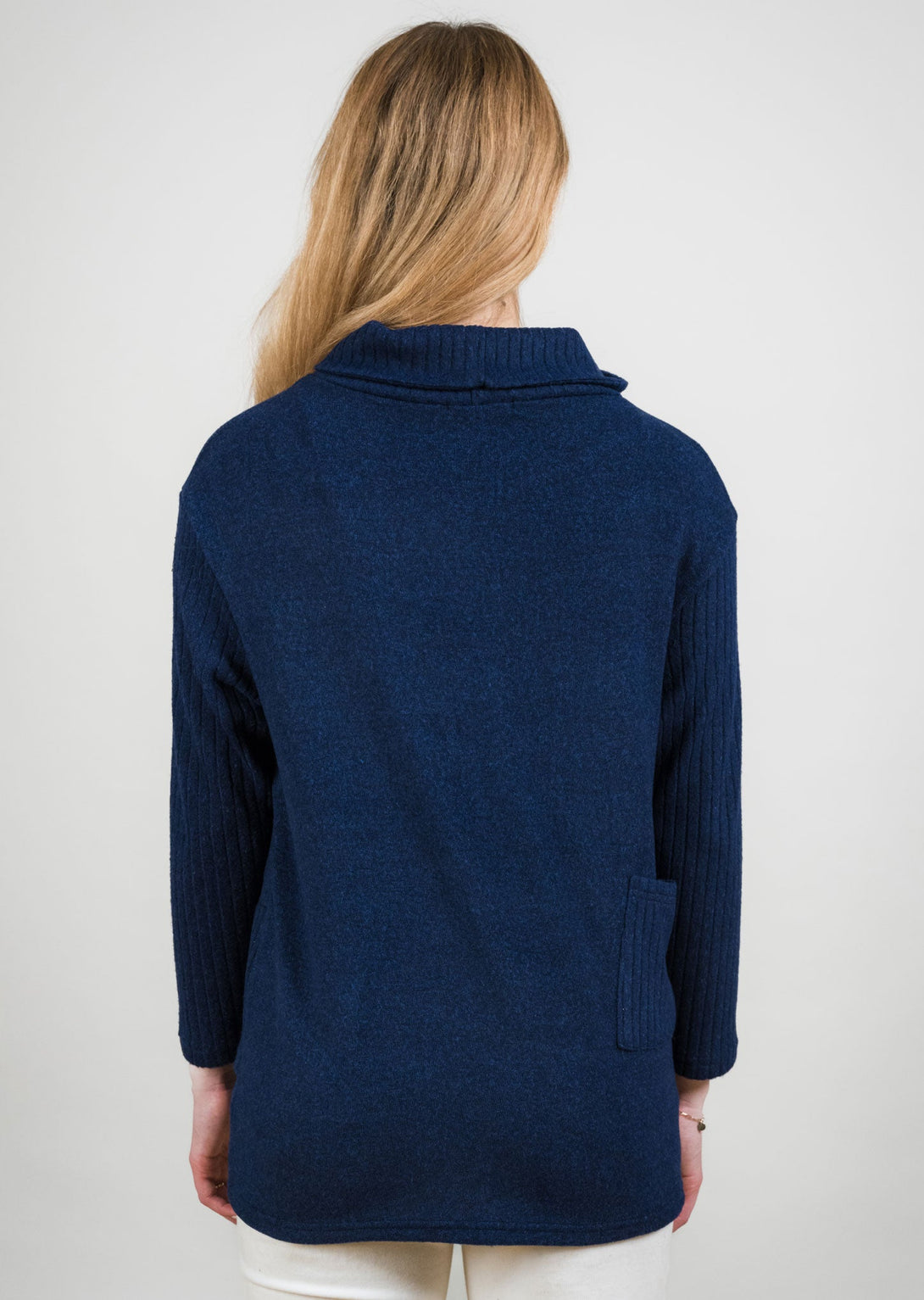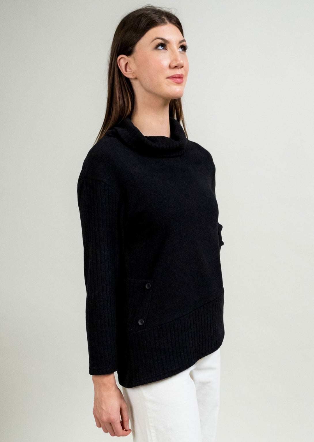 A cozy yet elevated tunic designed with a relaxed cowl neckline and ribbed sleeves for subtle texture. The asymmetrical hemline and button-accented side pocket add modern detail, while the soft knit fabric makes it an easy everyday layer. Perfect for pairing with denim or slim pants for effortless chic.