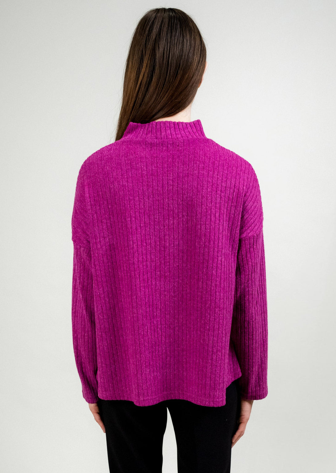 This rib detail shorter sweater in vibrant raspberry adds a playful pop of color to your wardrobe while keeping a timeless, easy-to-wear silhouette. Designed with a subtle mock neckline and dropped shoulders, it offers a relaxed yet polished fit. The ribbed texture on the sleeves and body gives it a touch of depth and dimension, while the cropped length makes it perfect for pairing with high-waisted trousers or skirts. Cozy yet lightweight, it’s the ideal knit for layering or wearing on its own from weekday outings to weekend plans.