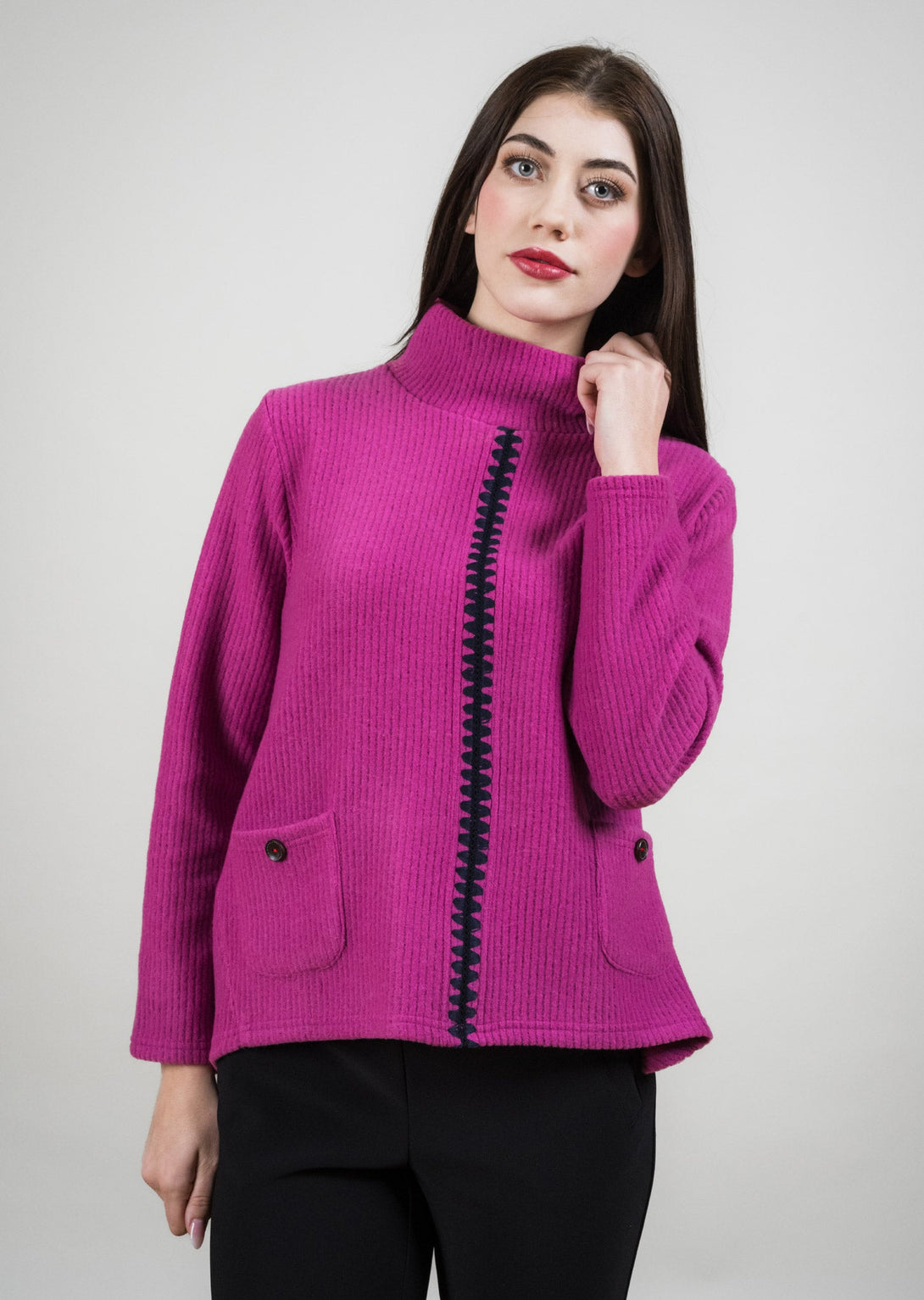 Cozy meets chic in this standout cowl neck sweater, designed in a vibrant fuchsia hue with a soft ribbed texture. The relaxed silhouette is elevated by contrast ric-rac stitch detailing along the front, adding a modern twist to a timeless style. Finished with two functional front pockets accented by button details, this piece blends comfort and practicality with bold, eye-catching style. Perfect for layering or wearing on its own, it’s a versatile addition to any wardrobe.