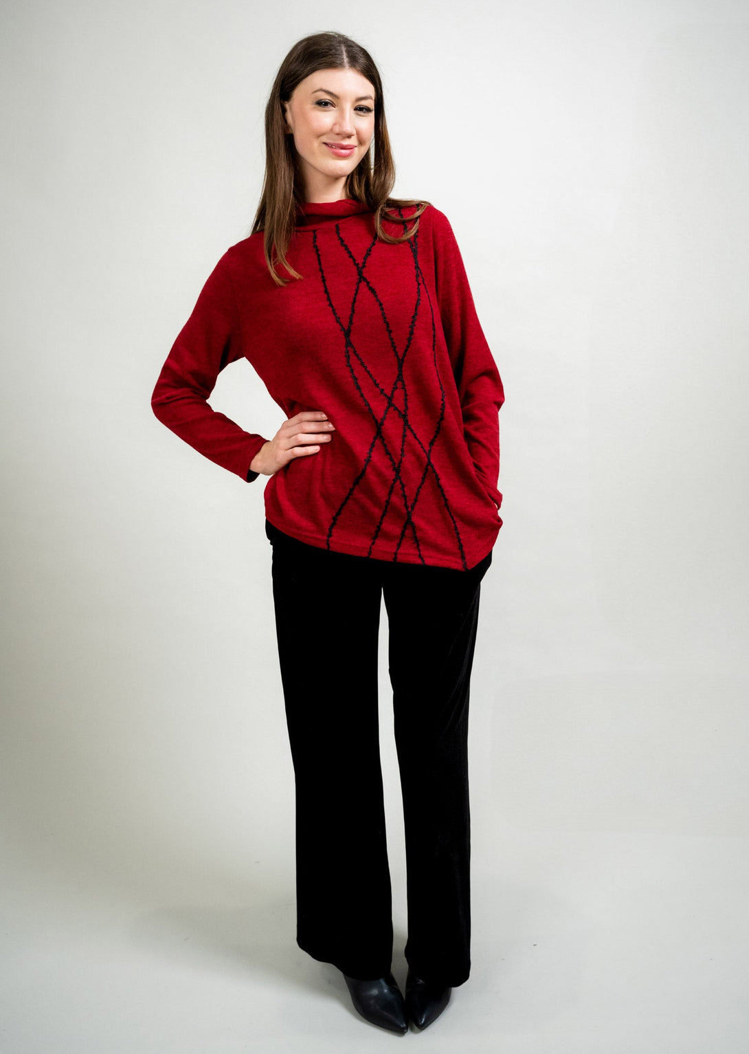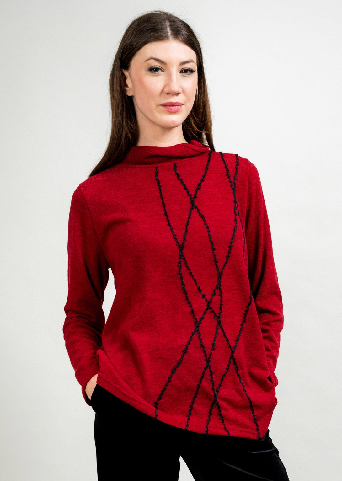 Elevate your everyday style with this chic funnel neck top, designed with a striking contrast embroidered pattern that elongates and flatters the silhouette. The rich hue pairs beautifully with the bold linear embroidery, creating a modern yet timeless look. Crafted from a soft, breathable knit, it offers both comfort and effortless sophistication. Perfect for pairing with tailored pants or denim, this piece is a versatile addition to your wardrobe that transitions seamlessly from day to evening.