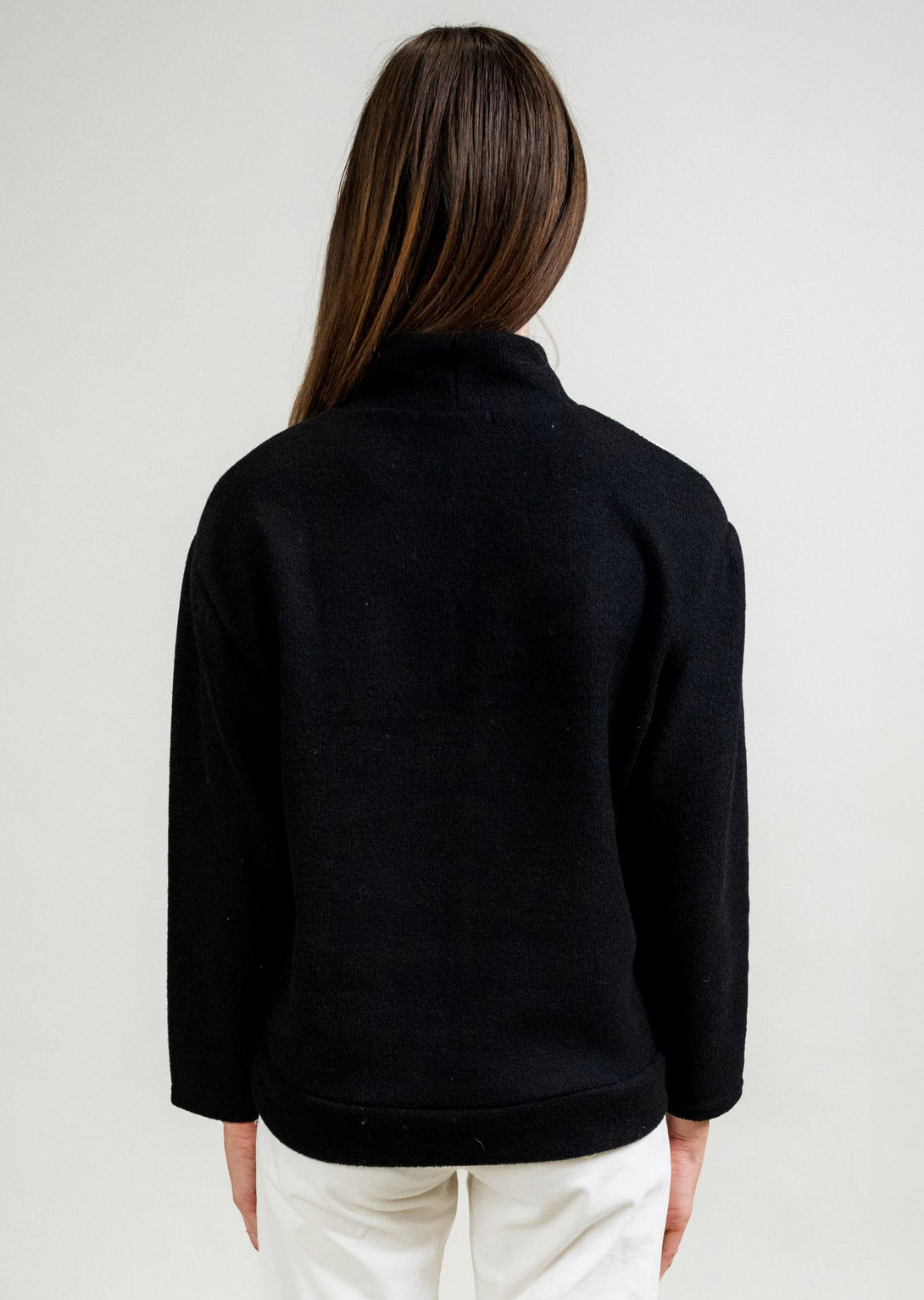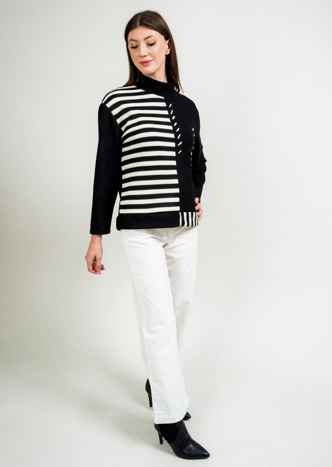 Bold yet versatile, this mockneck sweater makes a statement with its asymmetric stripe paneled design. The striking contrast of black and white creates a modern, graphic effect, while the clean silhouette ensures easy wearability. With long sleeves and a relaxed fit, it combines comfort with standout style. Perfect for pairing with tailored trousers or casual denim, this sweater is a chic upgrade to any wardrobe.