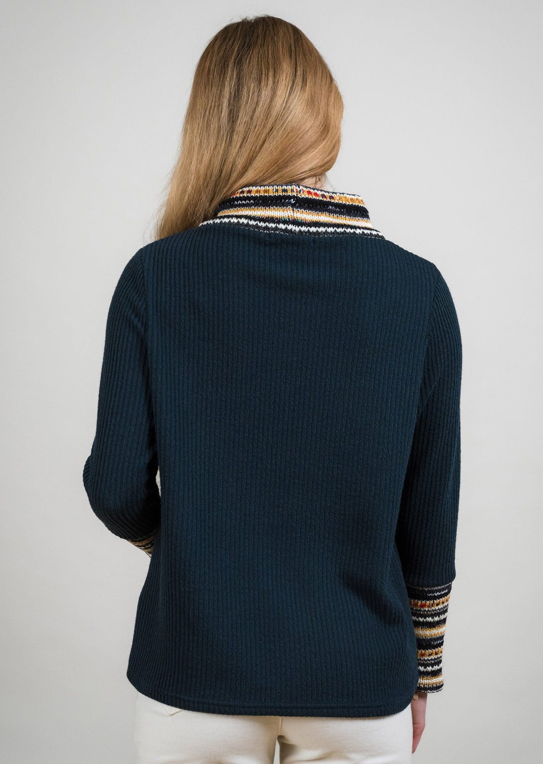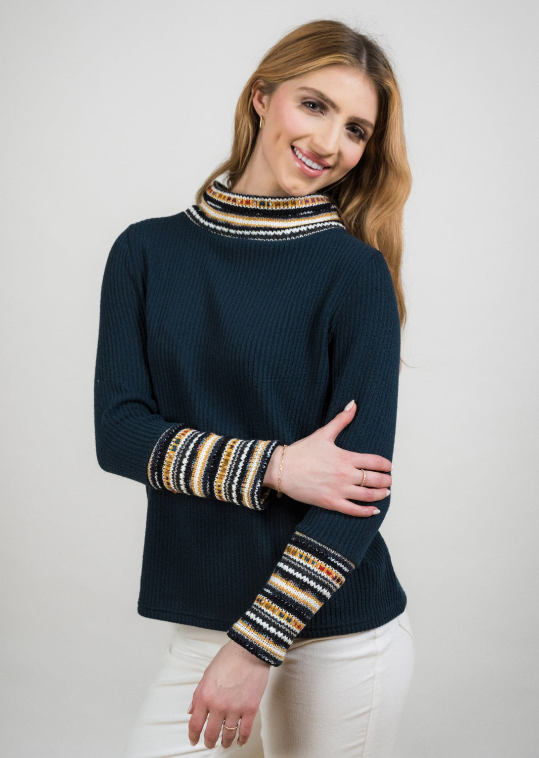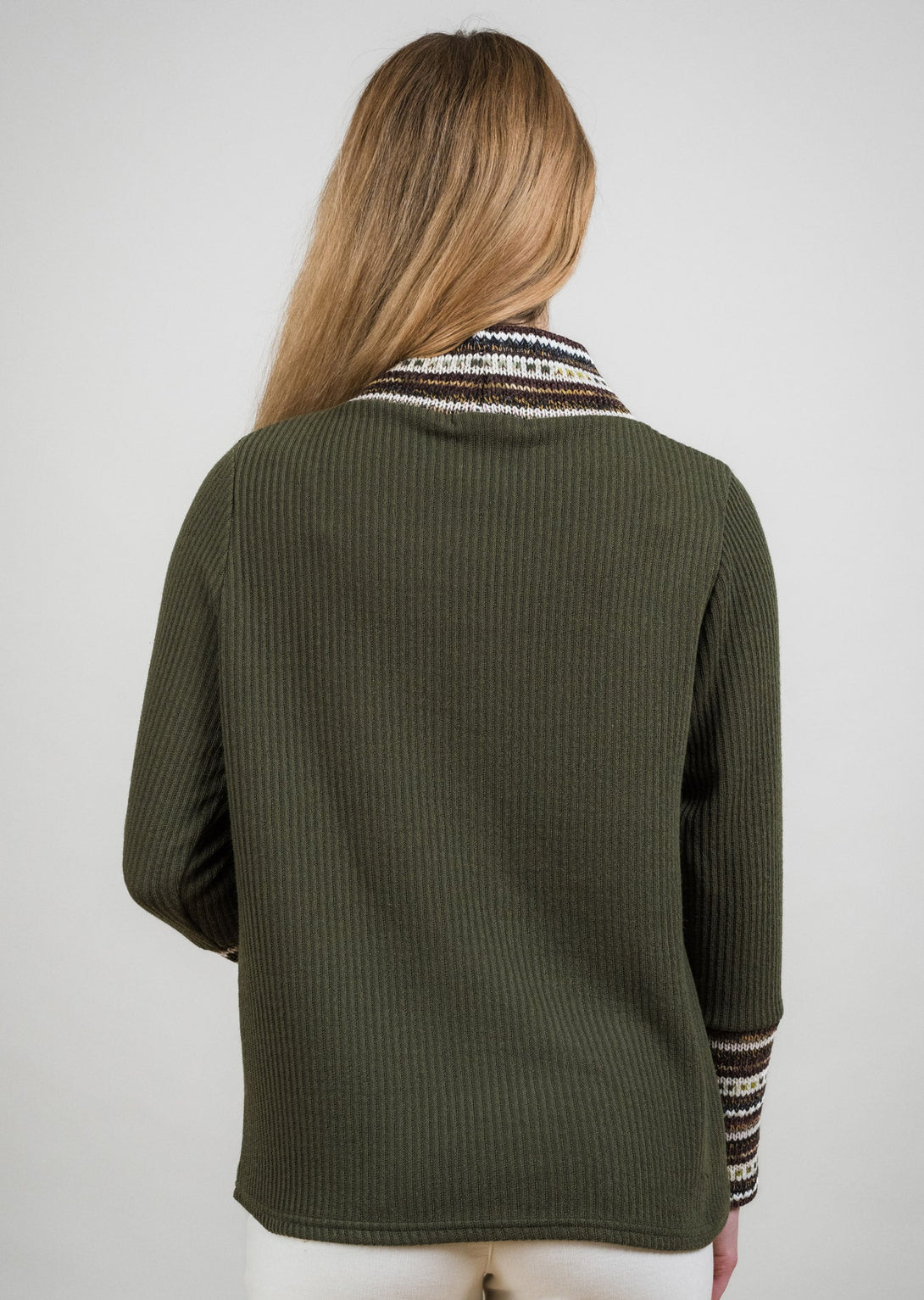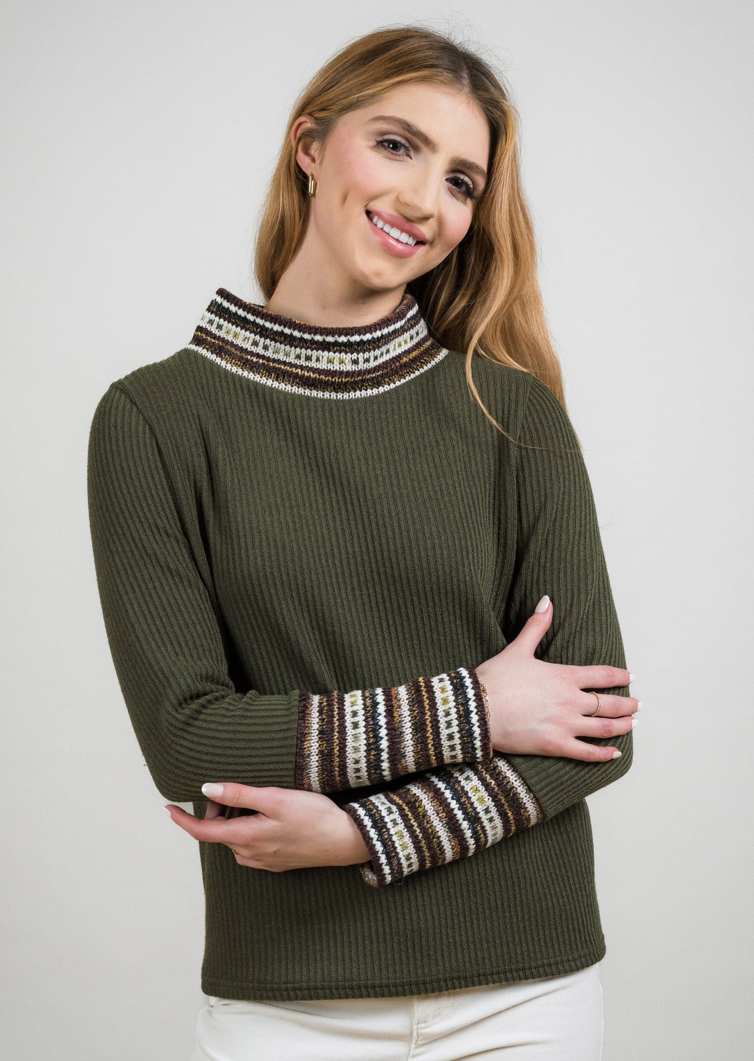 Effortless style meets timeless comfort in this contrast knit rib sweater. Crafted in a rich olive green hue, it features a classic ribbed texture elevated by patterned contrast detailing at the funnel neckline and cuffs. The straight silhouette offers an easy, relaxed fit, while the refined touches bring a polished edge to everyday wear. A versatile piece that pairs seamlessly with everything from tailored trousers to casual denim, it’s the perfect sweater to carry you through the season with understated elegance.
