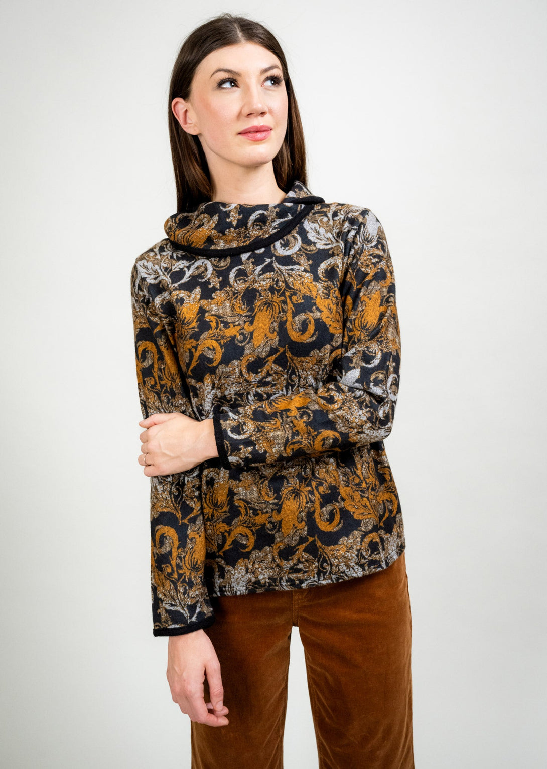 This sweater combines elegance and comfort with its ombre jacquard print in rich autumn tones. The foldover collar trimmed in contrast adds a refined touch, while the soft knit fabric makes it perfect for layering. A versatile style that transitions easily from casual days to more polished looks.