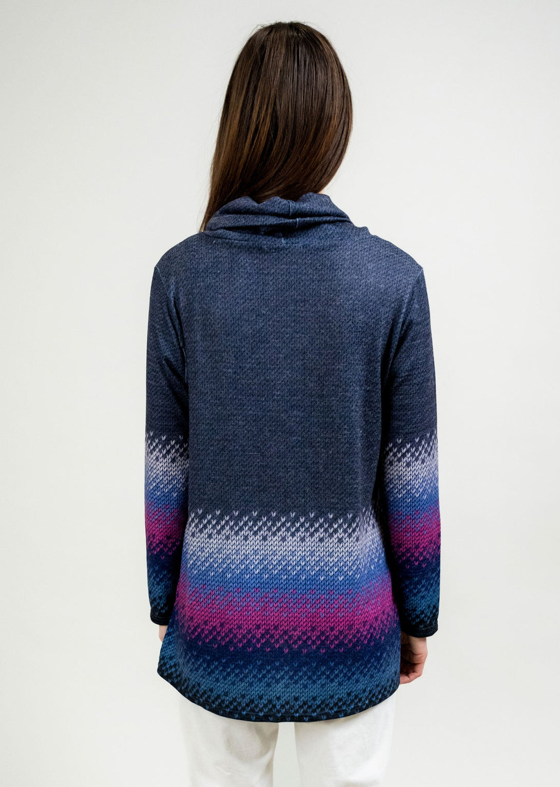 Softly brushed for a cozy feel, this cowl neck tunic brings comfort and elegance together in one easy silhouette. The ombré-inspired gradient moves from deep navy into vibrant shades of purple and magenta, creating a rich play of color that feels both modern and timeless. Designed with a relaxed fit and fluid drape, it’s the perfect piece for effortless layering and everyday sophistication.