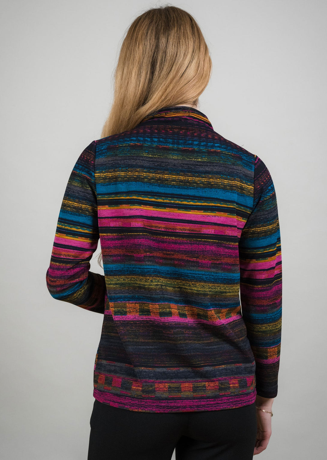 Vibrant and sophisticated, this striped stitch mock offers a striking mix of jewel-toned hues in blue, pink, gold, and teal set against a deep backdrop. The subtle mock neckline with stitch detailing adds a refined finish, while the soft, lightweight fabric drapes beautifully for everyday wear. Bold yet versatile, this piece brings effortless color and energy to your wardrobe, perfect for brightening cool-weather days.