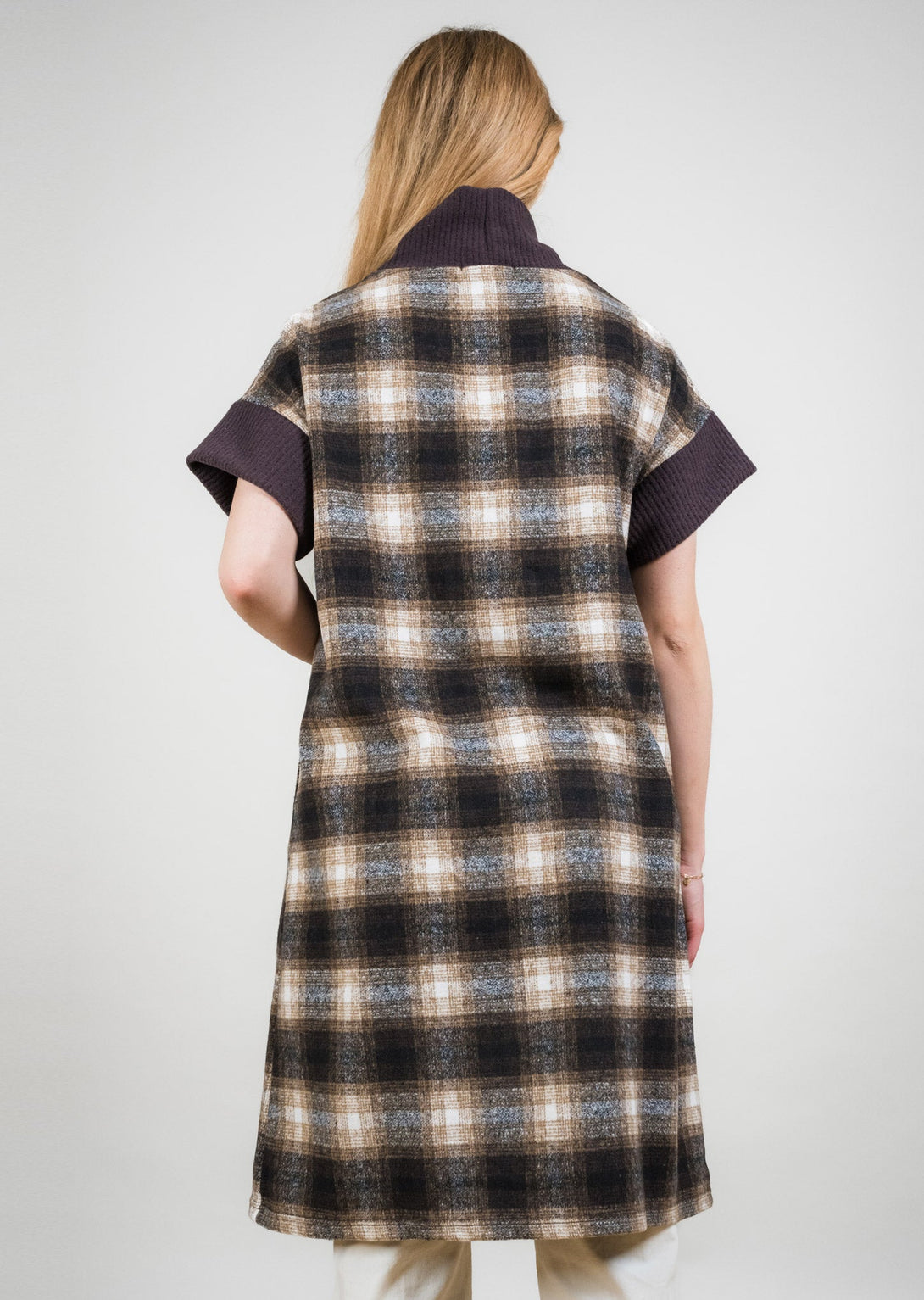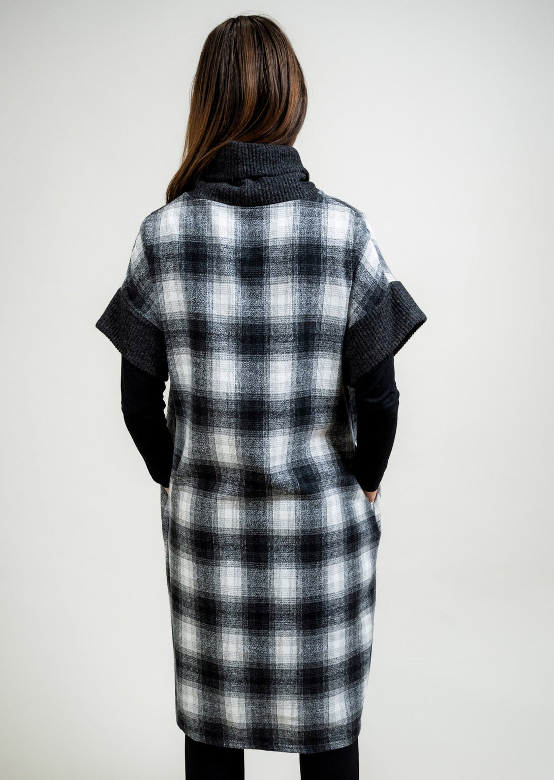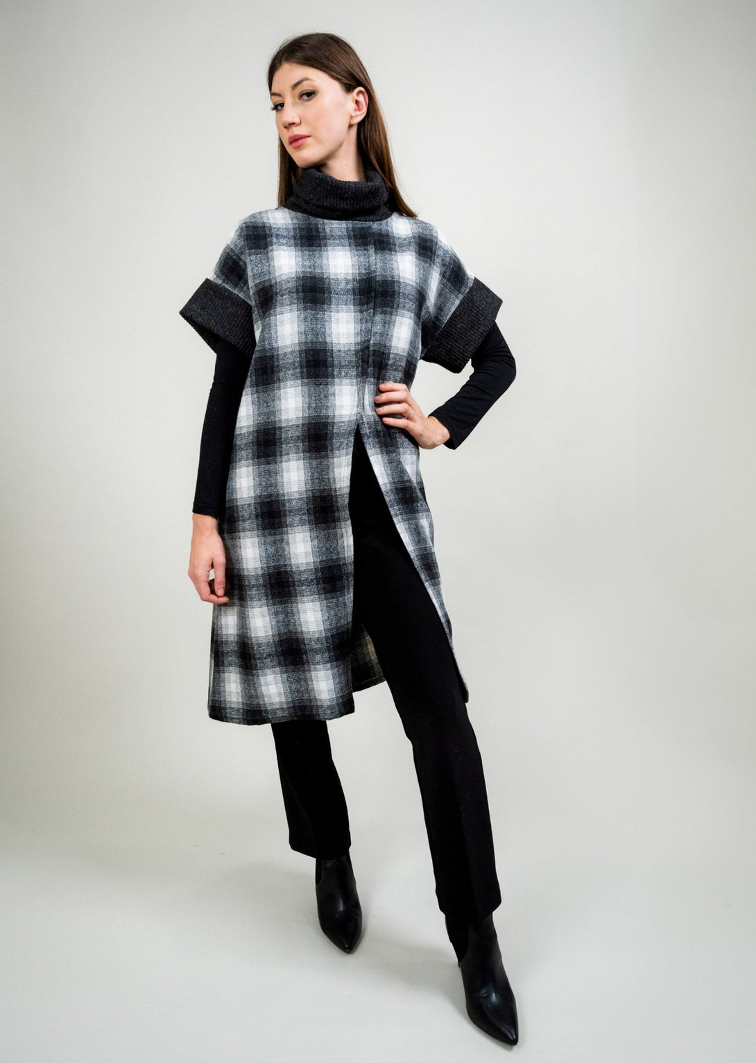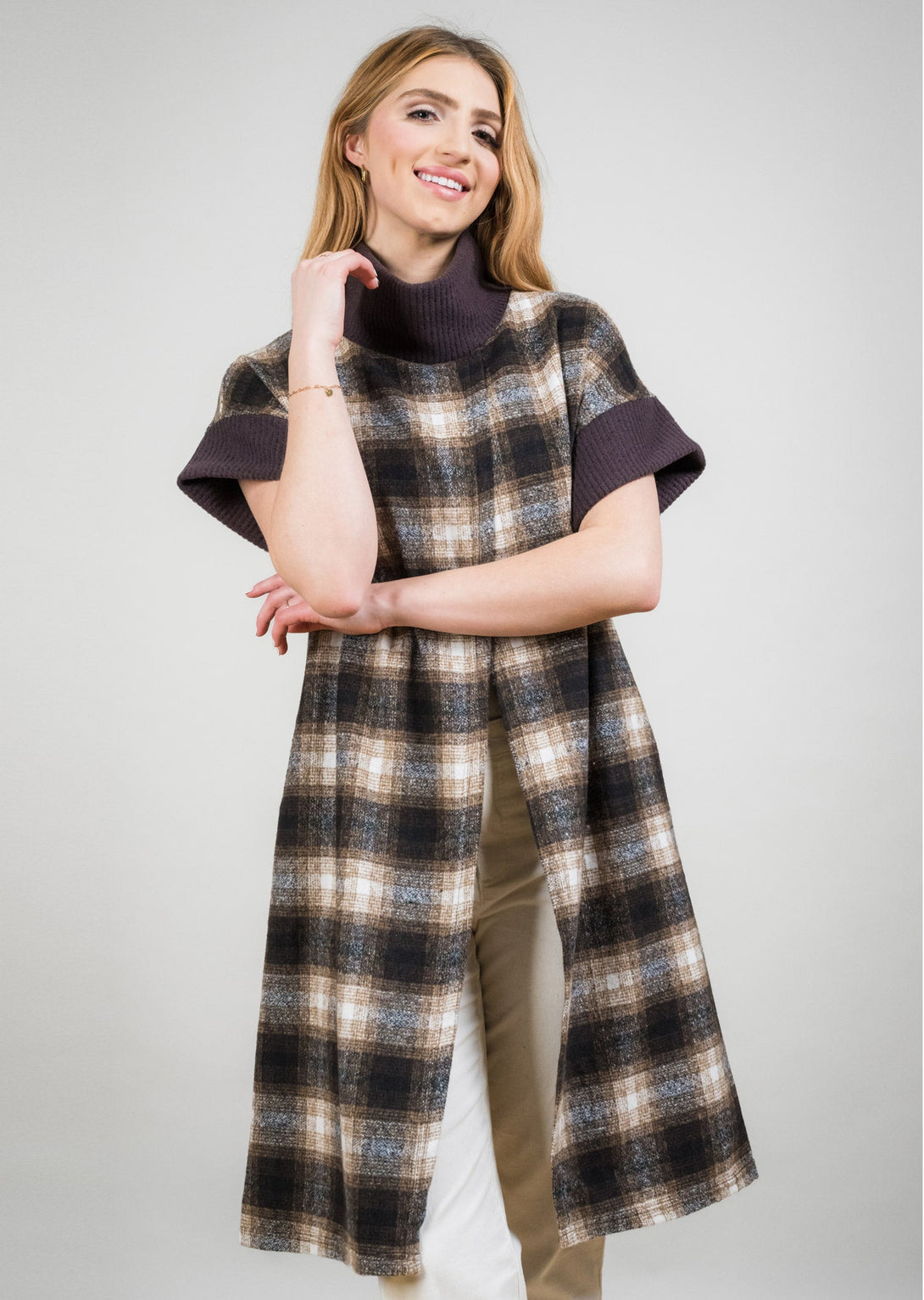This plaid slit front topper combines structure and ease with its longline silhouette and versatile layering potential. Designed with a soft check pattern, it features short cuffed sleeves, a cozy funnel neckline, and a front slit for fluid movement. The relaxed fit makes it easy to layer over slim pants or leggings, offering a modern yet timeless outerwear piece that transitions effortlessly from casual days to evenings out.